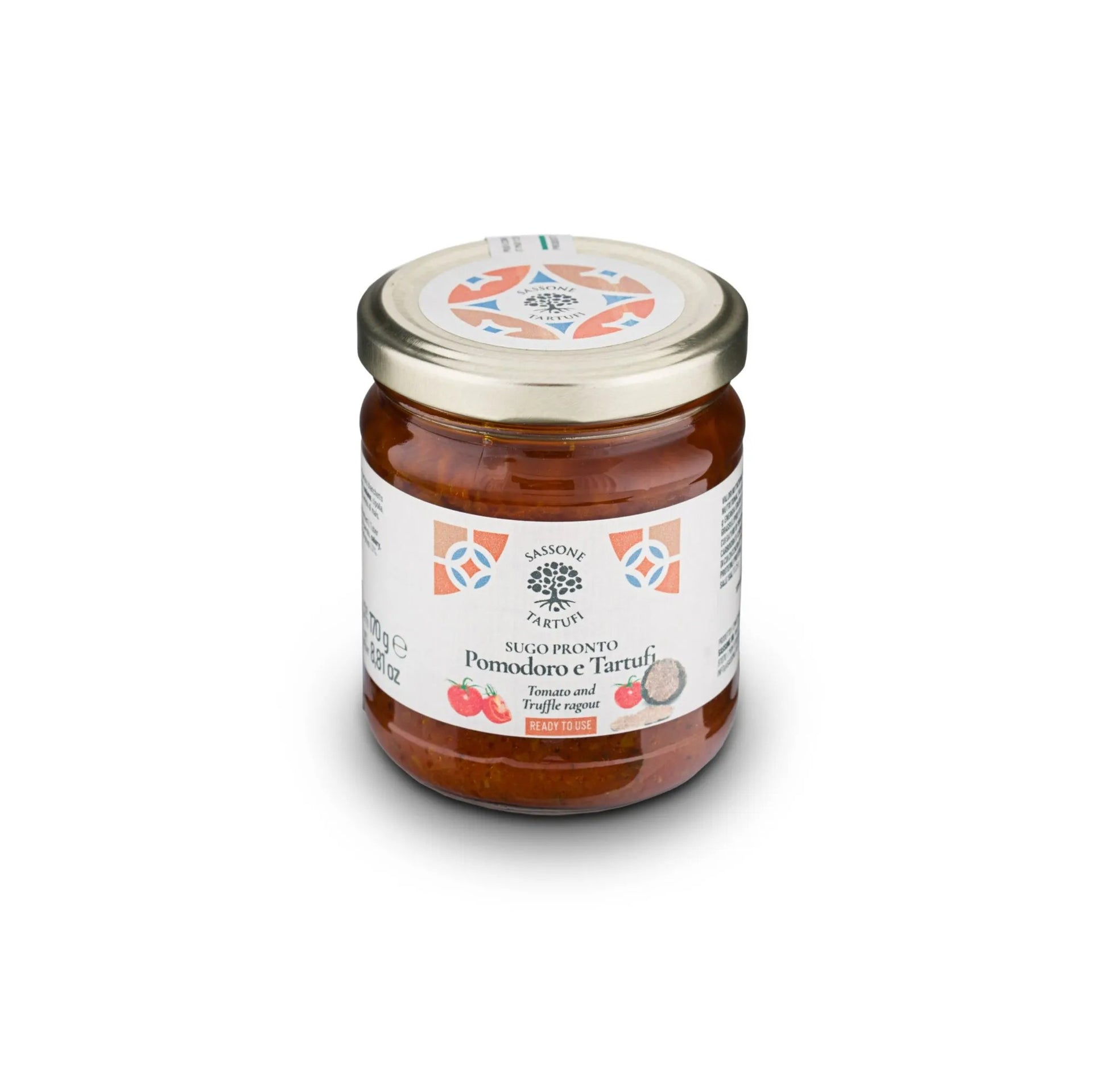 Sos de roșii, extract natural de trufă bianchetto (Tuber borchii Vitt. și grupul aferent) 15%, ulei de măsline extravirgin, morcovi, țelină, ceapă, trufă bianchetto (Tuber borchii Vitt. și grupul aferent) 3%, aromă naturală, arome, amidon de porumb.